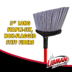 The Libman Rough Surface Angle Broom is the ideal sweeping solution for rough/outdoor surface sweeping, as well as wet, sticky floors. This stiff fiber Libman broom is built for pros, contractors, or if you are sweeping off your driveway or back patio. The polymer fibers are designed to clean rough surfaces, such as non-slip/non-skid, stone, terrazzo, concrete and other textured floor surfaces. The thick fibers are not flagged, making them great for sweeping rocks, sticks, and heavy debris. The powder coated steel handle resists chipping from dents and is equipped with a hanger hole for storage – no need for a fancy broom holder.
