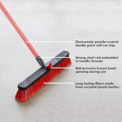 Whether cleaning fine dust or large debris, the Libman 24 in. Multi-Surface Push Broom captures everything across almost any surface. With a 25.5 in. sweeping width, the pushing broom head clears away debris with its flexible and firm fibers made from recycled PET bottles. With a combination of firm and flexible bristles, makes this one of the best brooms for outdoor use or indoor use. The 60 in. steel, powder-coated handle forms to any dings and resists chipping. It also comes equipped with a hanger hole on the handle grip for convenient storage, so there is no need for a broom holder or hangers for brooms.