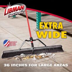 With large and heavy amounts of debris, the 36 in. Smooth Surface Heavy-Duty Push Broom is ideal for any smooth surface cleanups. Factory-assembled for durability, this pushing broom features 3″ soft, recycled PET, stapled fibers and a 1 in. diameter steel handle. The electrostatic powder coated paint will not chip, even from handle dings. With a 37 in. sweeping width, this push broom is excellent for large spaces such as garages, barns, sheds, patios, warehouses, and more. Due to its sheer size, this Libman broom is a great broom for outdoor use in large areas or one of the best brooms for sweeping up smooth warehouse concrete floors. No need for a broom holder or hangers for brooms as the handle grip has a convenient hanger hole for easy storage in your garage or shed.