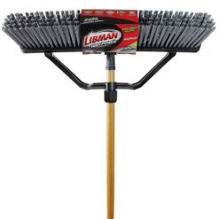 The Libman 24 in. Rough Surface Industrial Grade Push Broom moves mid to large debris across rough and semi-rough surfaces. The 24 in. polymer Libman broom head clears away all sizes of material with its super stiff, non-flagged bristles made from recycled PET plastic bottles. The 60 in. wooden handle and polymer brace give the user the ability to clear away the toughest jobs. This push broom is built to last with its wooden handle, polymer brace and robust bolted handle connection. Handle comes equipped with a grip and hanger hole for easy storage – no need for a fancy broom holder. Bulk PRO value pack contains 4 push brooms.