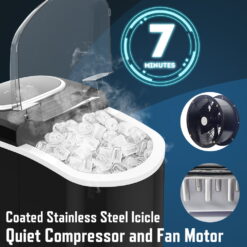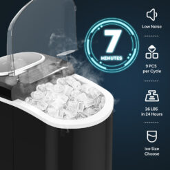 LifePlus portable ice maker will keep your drinks cool! This countertop ice maker can make bullet ice cube in just 7 minutes. Small ice maker produces 26 lbs ice cubes per day. Clear ice cubes are chewable in food grade. The transparent window allows you to watch the ice making process. LED lighting control panel allows you to choose between small crushed or large pebble ice cubes. Smart alarm with infrared sensor will remind you when water is short or the ice basket is full. This tabletop ice maker is very suitable for home party, family bars, shops, offices, etc.