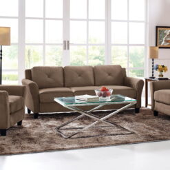 The Lifestyle Solutions Taryn Rolled Arm Sofa upholstered in brown fabric is the three seat option of this stationary set designed to fit your space and style. Built for lasting quality, the Taryn combines form, function and ease of assembly designed for the eclectic life. The design lines and scale of the Taryn Sofa brings a modern touch to spaces large and small with versatile elegance. High density foam cushions with rolled arms and beautifully button tufted back hug your body with comfort and is poised to transform any room into your favorite place to let go of the day and relax in pure bliss. Combining premium Brown microfiber upholstered fabric and solid eucalyptus wooden frame, this durable plush sofa invites you to rest in the knowledge of years of enjoyment to come.