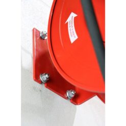 Air Reel is steel with 50 ft. x 1/2 in. rubber hose and ball stop. It has a slotted mounting base for easy installation. It has spring powered automatic recoil.