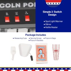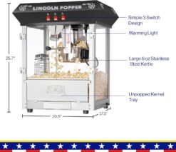 - 8 OZ POPCORN MACHINE – The Lincoln popcorn maker is perfect whether you’re feeding a crowd or enjoying a cozy movie night, featuring a built-in kettle stirrer, a heated deck, double doors for easy access, and a reject tray to collect un-popped kernels.