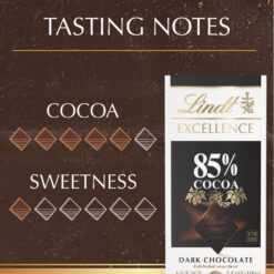 Dive into the refined richness of a Lindt EXCELLENCE 85% Cocoa Dark Chocolate Bar with all your senses. This full-bodied dark chocolate bar features a deep, dark color and attractive aroma with well-balanced cocoa notes that are robust, but not too intense, with an exceptionally silky feel. The sophisticated flavors in this dark chocolate candy bar make this gourmet chocolate the perfect pairing with cabernet sauvignon. Give a dark chocolate candy bar to your favorite chocolate connoisseur, or use them as baking chocolate for intense cocoa flavor in your premium chocolate desserts. This Lindt dark chocolate bar comes portioned into bite size squares, ensuring balanced complexity in each bite. Lindt chocolate is masterfully crafted using the highest-quality ingredients from world-renowned regions, embodying the passion and craftsmanship of Lindt Master Chocolatiers.