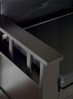 Create added seating and storage to your foyer or mudroom with this attractive and functional Loft on a padded storage bench. The bench features a flip-top lid, allowing the user to easily retrieve articles from the storage compartment. The black vinyl padded back and seat adds comfort to the piece. A dark black finish allows this piece to easily complement your home’s decor.