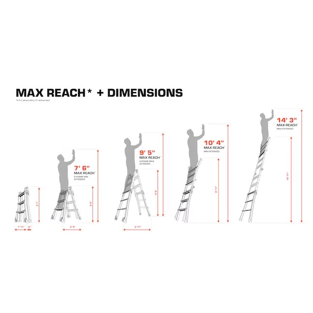 - Maximum reach of 14 feet 3 inches in extension ladder position (assuming a 5 ft 6 inch person with a vertical 12 inch reach)