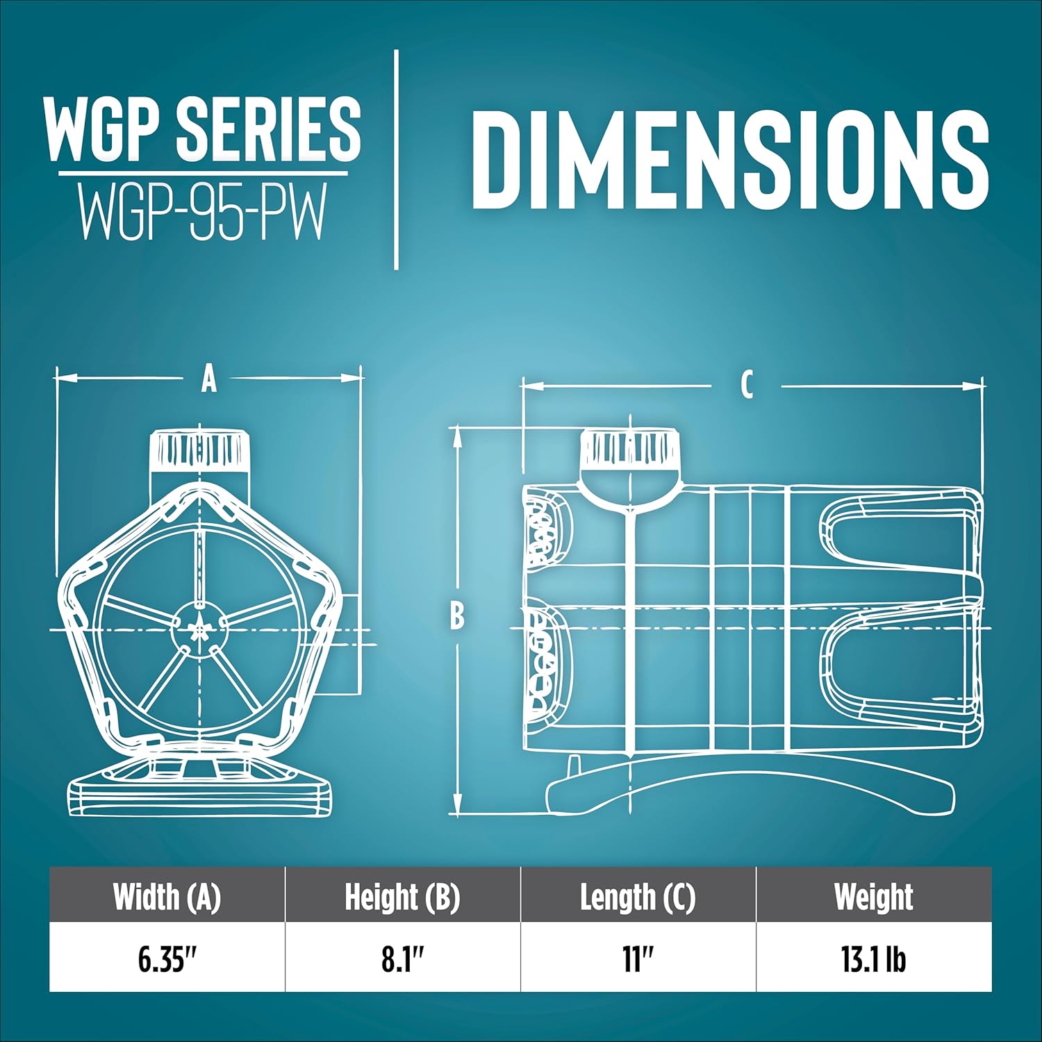 The Little Giant WGP-95-PW is ideal for use in waterfall and stream applications, this powerful direct-drive pump features a unique dual discharge design for operation of two water features simultaneously. This pump is extremely versatile, able to be used vertically or horizontally. Powerful direct-drive pump produces greater starting torque and flow pressure than comparable magnetic drive submersible pumps. Corrosion resistant body designed for non potable submersible use. 1.25-inch female pipe thread discharges, 1.25-inch barbed 90° elbow adapter included. Designed for ponds up to 2400 gallons; 4280 GPH; 30-ft. shut-off.