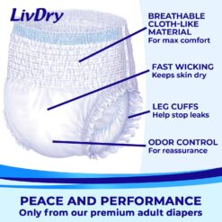 - OVERNIGHT INCONTINENCE PROTECTION – Get your tranquil rest again, in bed or during air travel despite loss of bladder control. LivDry premium disposable diapers (also called pull-ons or pull-ups) offer high absorbency. Always ships discreetly.
