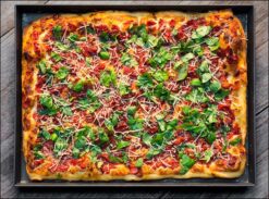 The real Grandma Style Pizza Pan that commercial restaurants use and you can too. Our exclusive Pre Seasoned Tuff-Kote (PSTK) finish adds an easy release coating, eliminating the need for any pre-seasoning. It’s non-toxic, metal utensil safe, PTFE free and permanent. It won’t flake, chip or peel. It’s easy to bake with, easy to clean and maintain. The 76 degree angle allows the pans to nest when empty, saving storage space. The double thick flat rim also adds strength and long lasting durability to this pan. Made of heavy duty .063” thick aluminum which allows faster bake times than steel pans, these commercial-quality pans are made to last. Made in the USA. Measures 16-inch x 12-inch x 1-inch. It will fit perfectly in standard home oven.
