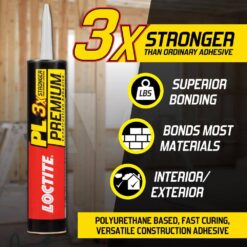 Loctite PL Premium Polyurethane Construction Adhesive is a 1-component, polyurethane-based, moisture-curing adhesive. It is VOC compliant and contains no chlorinated solvents or water. Loctite PL Premium provides superior adhesion to most common construction materials. It can be used for interior or exterior projects and is three times as strong as conventional solvent-based construction adhesives. It is also waterproof, paintable and cures even in cold temperatures. Ideal for sub floor installations, it bonds most common construction materials such as wood, treated wood, hardwood flooring, concrete, stone, marble, slate, masonry, brick, foam insulation of all sorts, carpets, metal, lead, cement-based products, ceramic, fiberglass, drywall and mirrors.