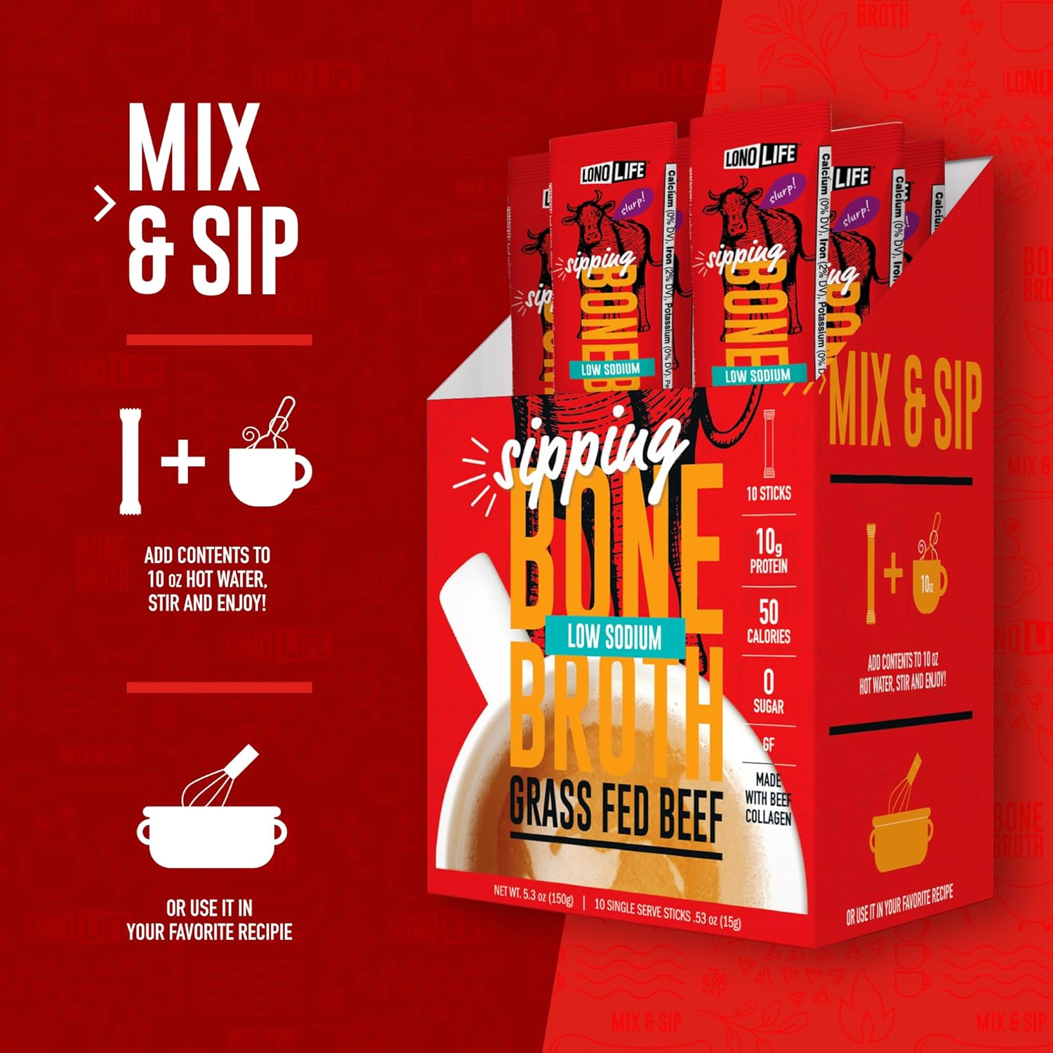 Heat 10 oz of water until hot (190°F/88°C). Pour one scoop of LonoLife bone broth into a mug. Add hot water to the mug and stir thoroughly (using a frother is a plus) until dissolved. Optional: Add extra seasonings or hot sauce. Enjoy your hot, nutritious bone broth. Store unopened packets in a cool, dry place. Perfect for travel, work, or outdoor activities.