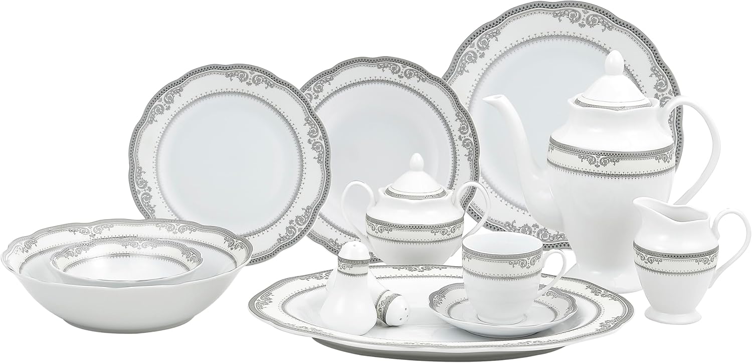 57 Piece Wavy Porcelain dinnerware set complete with a 6 piece place setting per person and serving pieces. Fine enough for formal dining, yet durable enough for daily casual use. This set features a Silver decorative border design. Dishwasher safe for easy cleap up. Serving pieces included will create a complete look on for your dining experience.