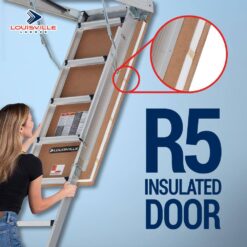 Louisville AH2240MG-R5 aluminum framed attic ladder offers an R5 insulated door with factory installed weather stripping providing more energy efficiency than a traditional attic ladder. Predrilled holes plus a lighter weight, more square aluminum frame provides easier installation than traditional wood framed attic ladders. Designed for attic openings of 22.5 in. x 54 in., the adjustable shoes allow the unit to fit ceiling heights from 7 ft. 8 in. to 10 ft. 3 in. Gas piston system allows easier and smoother opening and closing of the door. This attic ladder has a working load capacity of 375 lbs.
