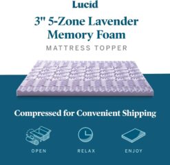 At Lucid, we make beds for the whole family — because when you wake up feeling your best, your family gets the best version of you too. The Lucid 5 Zone Lavender Memory Foam Mattress Topper is an affordable way to soften a too-firm mattress, revitalize and old mattress, or prolong the life of a newer mattress. This responsive memory foam layer cradles your body with a soft “sink-in” feeling while five specialized comfort zones target the pressure points in your body to relieve aches and pains for a great night’s sleep. Plus, this versatile topper can be used zoned side up for a targeted and plusher feel or zoned side down for a more even and firm feel that still provides plush, zoned support. This bed topper is also infused with a soothing lavender scent to help calm your senses and create a naturally relaxing atmosphere to enhance your sleep. Available in a plush 2-inch profile and even plusher 3-inch profile, this topper is designed to perfectly align with most standard size mattresses and is shipped right to your door in an easy-to-carry box.