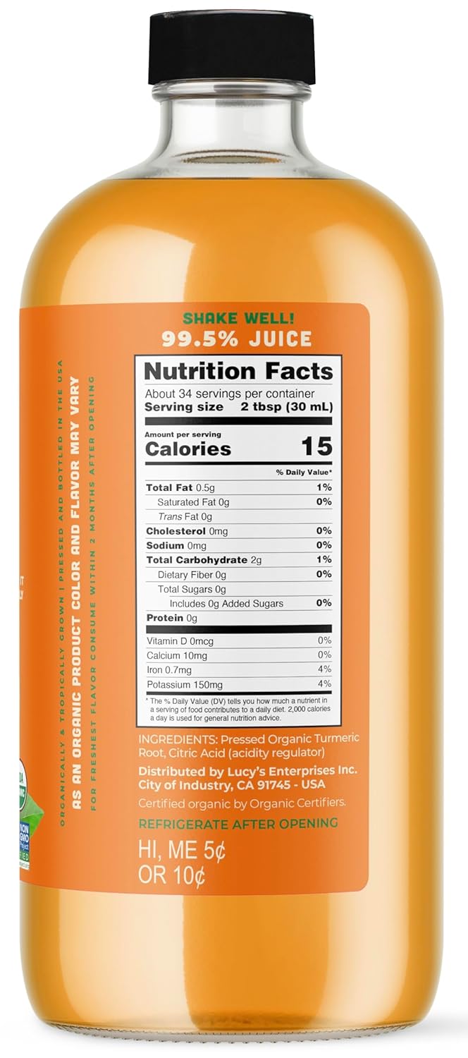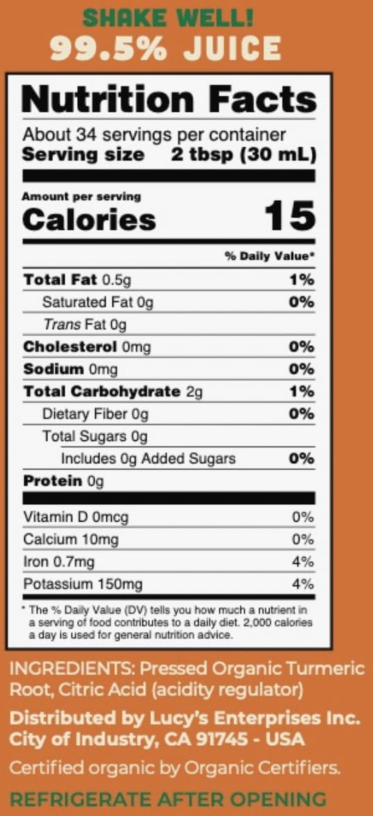 - EARTHY ORGANIC TURMERIC JUICE – Lucy’s Organic & Non-GMO Turmeric Juice will speak for itself. Try a 1oz. shot or mix qual parts water or juice and enjoy. You will fall in love with its vibrant hue and rich, earthy flavor, as it offers a bold and invigorating sip of nature’s goodness. This is hallmark of Turmeric and what proves our Organic Turmeric Juice as truly genuine. We have not diluted anything with water because we know our customers love the incredible impact of Pressed Turmeric.