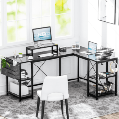Lulive 95″ Reversible Computer Desk, L Shaped Desk Office Desk with 4 Shelves/Monitor Stand/ Storage Bag/Hooks for Home Office, Black