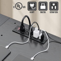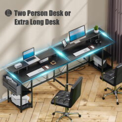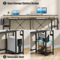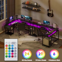 The desk has an adjustable design, allowing you to choose the assembly method according to your space freely. It features 4 standard plug outlets and 2 USB ports, making it easy to connect and charge your computer, printer, scanner, phone, tablet, gaming gear, and other devices. The desk with a monitor stand, an additional storage bag, and 2 side hooks that can be configured on either side. The desk is also equipped with RGB LED lights, offering 20 colors, 8 adjustable brightness levels, and 5 flicker frequencies to create a perfect gaming atmosphere.