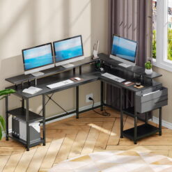 Lulive L Shaped Desk with LED Light and Power Outlet, 95″ Reversible Corner Computer Desk with Monitor Stand and Storage Shelf, Modern L- Shaped Gaming Desk, Black