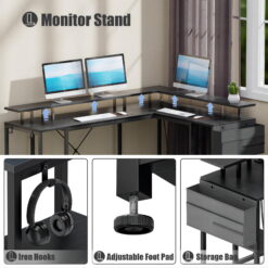 - Special Feature: Hooks, Fabric Box, Monitor Stand, Reversible, Built-In USB Outlet, Built-in Cool & Smart Led Light Strips.Hooks,