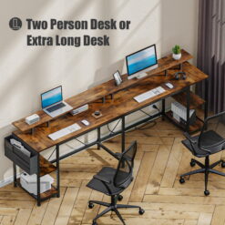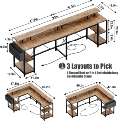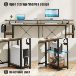 The desk has an adjustable design, allowing you to choose the assembly method according to your space freely. It features 4 standard plug outlets and 2 USB ports, making it easy to connect and charge your computer, printer, scanner, phone, tablet, gaming gear, and other devices. The desk with a monitor stand, an additional storage bag, and 2 side hooks that can be configured on either side. The desk is also equipped with RGB LED lights, offering 20 colors, 8 adjustable brightness levels, and 5 flicker frequencies to create a perfect gaming atmosphere.