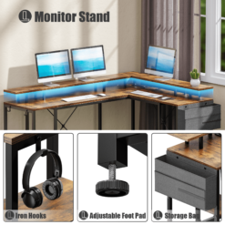 - Special Feature: Hooks, Fabric Box, Monitor Stand, Reversible, Built-In USB Outlet, Built-in Cool & Smart Led Light Strips.Hooks,