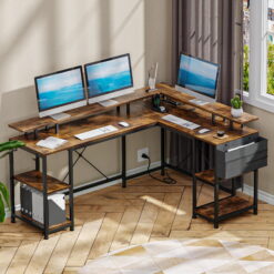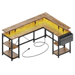 Lulive L Shaped Desk with LED Light and Power Outlet, 95″ Reversible Corner Computer Desk with Monitor Stand and Storage Shelf, Modern L- Shaped Gaming Desk, Brown