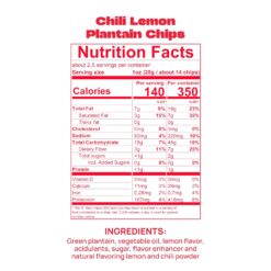 - ONLY THREE INGREDIENTS: Green plantain, Vegetable Oil and Lemon Flavor.
