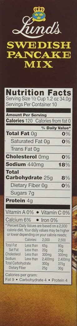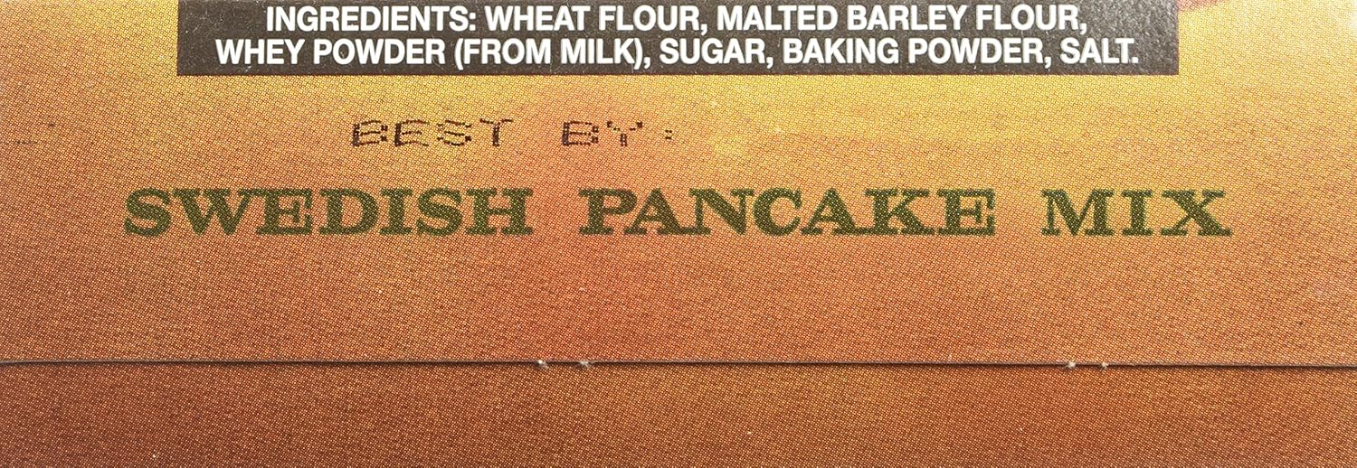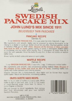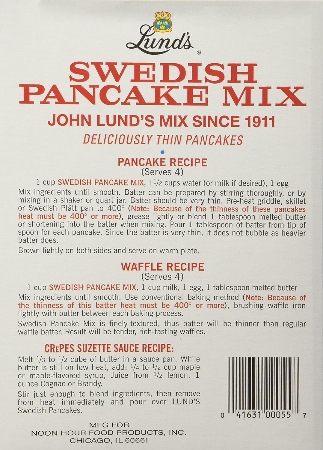 Pancake recipe (serves 4): 1 cup Swedish Pancake Mix, 1-1/2 cups water (or milk, if desired), 1 egg. Mix ingredients until smooth. Batter can be prepared by stirring thoroughly, or by mixing in a shaker or quart jar. Batter should be very thin. Pre-heat griddle, skillet or Swedish Platt pan to 400 degrees. (Note: Because of the thinness of these pancakes heat must be 400 degrees or more), grease lightly or blend 1 tbsp of batter from tip of spoon for each pancake. Since batter is very thin, it does not bubble as heavier batter does. Brown lightly on both sides and serve on warm plate. Waffle recipe (serves 4): 1 cup Swedish Pancake Mix, 1 cup milk, 1 egg, 1 tbsp melted butter. Mix ingredients until smooth. Use conventional baking method (Note: Because of the thinness of this batter heat must be 400 degrees or more), brushing waffle iron lightly with butter between each baking process. Swedish Pancake Mix is finely-textured, thus batter will be thinner than regular waffle batter. Result will be tender, rich-tasting waffles.