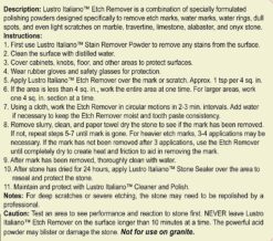 Lustro Italiano Etch Remover 8oz. Lustro Italianoâ„¢ Etch Remover is a combination of specially formulated polishing powders designed specifically to remove etch marks, water marks, water rings, dull spots, and even light scratches on marble, travertine, limestone, alabaster, and onyx stone.