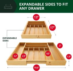 - 𝑬𝑿𝑷𝑨𝑵𝑫𝑨𝑩𝑳𝑬 𝑻𝑶 𝑭𝑰𝑻 𝑴𝑶𝑺𝑻 𝑺𝑻𝑨𝑵𝑫𝑨𝑹𝑫 𝑲𝑰𝑻𝑪𝑯𝑬𝑵 𝑫𝑹𝑨𝑾𝑬𝑹𝑺: Our deep bamboo drawer organizer is ideal for saving kitchen storage space, thanks to its adjustable storage drawers that expand from 17”x13” to 17×19.6” wide with 1.9” deep slots. Easy to use and ideal for helping to maximize kitchen storage space, simply pull apart from the sides for additional storage space and a more secure fit for wider drawers. Different sized compartments allow for standard silverware and large utensil placement