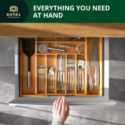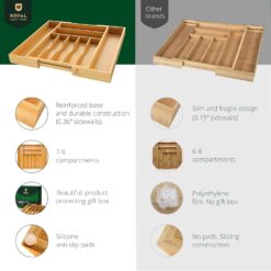 Royal Craft Wood’s drawer organizer features 7 main slots for everyday spoons, forks, knives, and serving utensils, with an additional 2 compartments for larger kitchen gadgets, expanding to fit up to 9 organizing slots.
