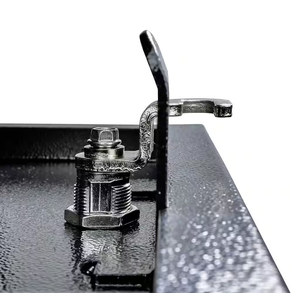 - Patented anti-pry latch locking system featuring a chrome-alloy tempered steel hook cam