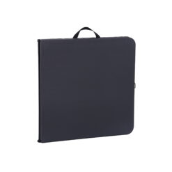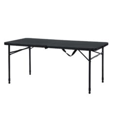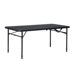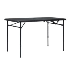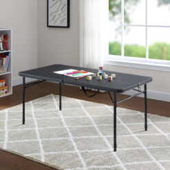 Provide all of the tablespaces that you need in all kinds of settings with the Mainstays 4′ Fold-In-Half Adjustable Table in Rich Black. This versatile rectangular table is sturdy and durable, made with reliable materials, and folds for easy storage and transportation. When you’re finished using it, just fold in the metal legs, fold the table in half, and your new compact table is ready for transport! Its classic black color is sure to fit in at any gathering in any setting, and its spacious expanded 48″ long table-top is ideal for holding a wide variety of foods, crafts, or whatever items you are working with! It’s great for everyday use both indoors and outdoors, as a serving table, craft supply table, outdoor meal table, or for whatever purposes you may need. The plastic tabletop is easy to clean with no fuss just wipe it down with a damp cloth, and it will look as good as new! The carrying handle makes it perfect for taking on the go, for outdoor barbecues, game nights, school activities, parties, or tailgating events. The table comfortably seats 4 adults, so all of your friends and family can be included.