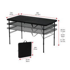 - Rectangular folding table: 48″ W x 24″ D x 21.14″ – 28.03″ H