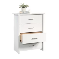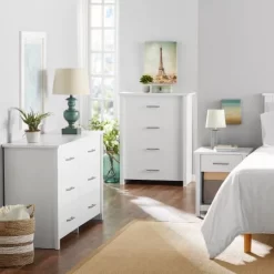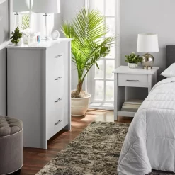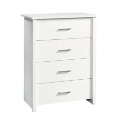 Keep clothes neat and organized in a large-drawer dresser like the Mainstays™ Hillside collection 4-drawer bedroom chest. With four drawers that are constructed with metal runners and safety stops, there is space for all your folded items in this bedroom furniture. Bulky items like sweaters, jeans and sweatshirts store effortlessly with the spacious drawer storage in this bedroom chest of drawers. Its spacious design allows for neat and easy storage of items like blouses, pajamas, and linens. Wherever you need more clothes storage, this white chest of drawers has your back—whether it is the guest room, master suite, or children’s bedroom. With a versatile white finish, this 4-drawer dresser fits any bedroom design. The Mainstays™ Hillside collection offers you sleek, functional, and stylish storage and organizing solutions and this 4-drawer chest is one example of the many excellent options.