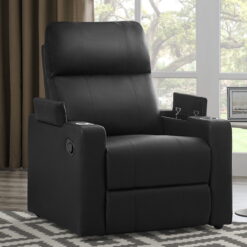Modern and eye-catching, the Mainstays Home Theater Recliner is the perfect addition to any room in your home. Sleek PU leather upholstery is accented by a thin linear stitching that will complement a variety of home decor styles, whether it be in your living room, family room, entertainment room or home theater. Seat and chair back are generously cushioned with high-density foam for supreme comfort. The in-arm storage compartments are nice and deep so they are great for storing media and accessories. They are also equipped with in-arm USB charging ports for easily charging your cell phone, tablet and other electronic accessories. Built-in cup holders are conveniently placed on both sides for easy access. Strength and durability is guaranteed with a sturdy wood frame construction. Supportive suspension straps add an extra layer of durability to help this chair last. Kick back, grab some popcorn and catch up on all your TV Shows in the Mainstays Home Theater Recliner.
