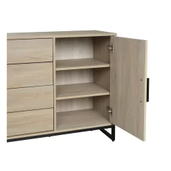 The Mainstays Mixed Material Long Dresser is the perfect solution for organized living. With 4-drawers feature durable ball bearing slides that offers spacious storage for you to keep your blouses, T-shirts, pajamas, jeans, sweaters neatly and stay where it belongs. Each drawer is finished in a smooth linen look paper to keep your clothes from snagging on raw edges. With 1 open door and 1 shelf that create extra spaces to stock anything you would like to keep inside. This dresser is constructed of laminated wood in beautiful beige color and unique metal feet in classic black finish that gives the Dresser an Industrial look that fits into any style of your room. Anti-tip hardware kits are included to secure the Dresser to the wall, it’s perfectly preventing tipping injuries and keep your family safe. Two adults are recommended to complete the assembly. Once assembled, the Dresser measures to be 47.5“W x 15.75″D x 29.75″H.