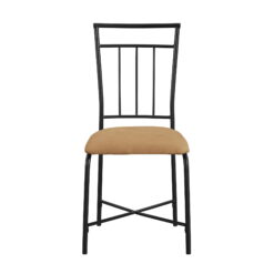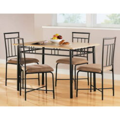 The compact and stylish dining set is great for small spaces and perfect for apartments, kitchens, or dorm rooms. This set consists of a sturdy metal table with an easy-to-clean wood top. The four metal chairs feature dark beige upholstered seats that tuck in neatly when not in use. The dining set will complement virtually any home decor and is a wonderful way to bring warmth and comfort into your kitchen or dining area.