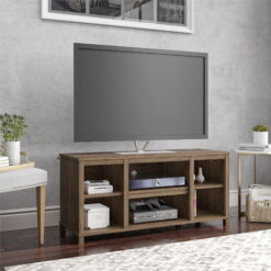 The Mainstays Parsons tv stand is just the right size for your flat paneled tv up to 50″ wide. This tv stand has tons of open storage so you can keep your cable box and gaming system on the 2 center shelves and still have room to organize your books, remotes, and DVDs on the other 4 shelves. The wire management holes in the back panel keep your cords organized and tangle-free. With a laminated particleboard build, the medium brown woodgrain finish adds a modern touch to your space.