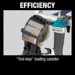 The Makita 2-1/2 in. Roofing Coil Nailer (AN613) offers rugged construction and robust performance. The AN613 drives 15º wire and plastic collated nails for added convenience. The AN613 is engineered for longer tool life with durable and lightweight aluminum housing and an easy-loading adjustable canister. Ease-of-use features include a tool-less depth adjustment with nine detents settings engineered for more precise control and flush nailing. Additional features include rubber bumpers to protect the tool, smooth nose tip to prevent scratching, a multi-directional exhaust port, and reversable belt hook.