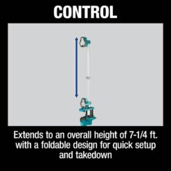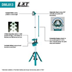 The 18V LXT Tower Work Light (DML813, tool only) is a tall, towering light extending to an overall height of 7-1/4 feet. It delivers 3,000 /1,700 /900 lumens on High / Medium / Low settings. Get up to 10 hours of continuous illumination with one 18V LXT 5.0Ah Battery on low and up to 2 hours on high (battery and charger not included). L.E.D. lights effectively illuminate work area without the high heat of halogens. This tower light features an adjustable head that rotates 220-degrees vertically and pivots 230-degrees horizontally. Other features include a dust and water-resistant construction (IP55-rated when using battery) for improved operation in harsh job site conditions. The tower folds and features convenient should strap and handles for easy transportation. It is part of Makita’s 18V LXT System. The LXT Cordless System, the world’s largest cordless tool system powered by 18V lithium-ion slide-style batteries, takes a user from power tools to outdoor power equipment to get the job done. Makita 18V LXT Batteries have the fastest charge times in their categories, so they spend more time working and less time sitting on the charger.
