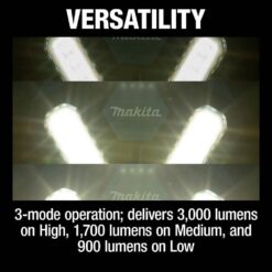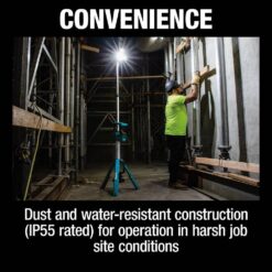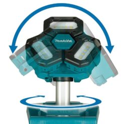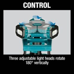 The 18V LXT Tower Work/Multi-Directional Light (DML814, tool only) is a tall, towering light extending to an overall height of 7-1/4 feet. It delivers 3,000 /1,700 /900 lumens on High / Medium / Low settings.Get up to 10 hours of continuous illumination with one 18V LXT 5.0Ah Battery on low and up to 2 hours on high (battery and charger not included). L.E.D. lights effectively illuminate work area without the high heat of halogens. This tower light features three adjustable heads that rotate 180-degrees vertically.Other features include a dust and water-resistant construction (IP55-rated when using battery) for improved operation in harsh job site conditions. The tower folds and features convenient should strap and handles for easy transportation.It is part of Makita’s 18V LXT System. The LXT Cordless System, the world’s largest cordless tool system powered by 18V lithium-ion slide-style batteries, takes a user from power tools to outdoor power equipment to get the job done. Makita 18V LXT Batteries have the fastest charge times in their categories, so they spend more time working and less time sitting on the charger.