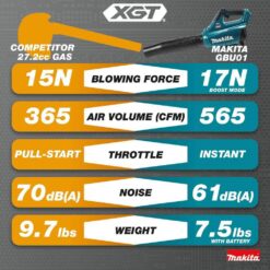 - GBU01M1 – OUTPOWER: Makita-built Brushless Motor delivers up to 565 CFM and 143 MPH