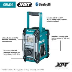 Get rich, full stereo sound with the 40V Max XGT Cordless Bluetooth Job Site Radio (GRM02, Tool Only). Bluetooth provides wireless connection from any mobile device to play music. Menu controls to set FM mono/stereo, volume, clock settings, and snooze. It features an auxiliary port for MP3 compatibility, and two powerful side-firing speakers. It comes equipped with Extreme Protection Technology (XPT). XPT is a series of integrated seals designed to provide increased dust and water resistance in harsh job site conditions. This makes the radio ideal for any location such as job sites, workshops, or the yard. XGT is a system of equipment, tools, batteries and chargers utilizing 40V Max lithium-ion batteries. XGT is engineered to deliver high power to take on high-demand applications, allowing users to completely transition to a cordless job site. XGT is equipped with advanced brushless motor engineering, intelligent digital communication, and superior durability features to outpower, outsmart and outlast the competition. Compatible with 40V Max XGT Batteries and 18V LXT Batteries.