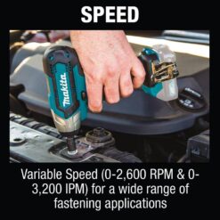 The Makita 12-Volt maximum CXT Cordless 1/4 Impact Wrench, Tool Only (WT04Z) delivers power and speed in a compact size for efficient fastening. It is an ideal solution for working in tight spaces and overhead applications. With Makita 12-Volt maximum CXT Lithium-Ion slide-style batteries (sold separately), users get superior balance and ergonomics over pod-style batteries. For longer run time, 12-Volt maximum CXT cordless tools are also compatible with the 12-Volt maximum CXT Lithium-Ion 4.0 Ah battery (BL1041B). 12-Volt maximum CXT Lithium-Ion batteries are engineered with a Battery Protection Circuit that protects against overloading, over-discharging and over-heating. Its part of the expanding 12-Volt maximum CXT series, combining performance with superior ergonomics in a compact size. The 12-Volt maximum CXT 1/4 Impact Wrench weighs only 2.3 lbs. (with 2.0 Ah battery, sold separately), with variable speed (0-2,600 RPM and 0-3,200 IPM) and 44 ft. lbs. of maximum Torque. Makita’s entire line-up of impact drivers and impact wrenches including the WT04Z is engineered with a proprietary hammer and anvil impact mechanism that is manufactured using the best raw materials with the highest quality steel, as well as a unique heat-hardening process for maximum fastening and driving power.