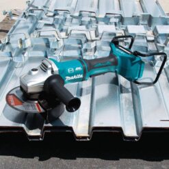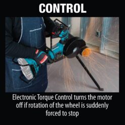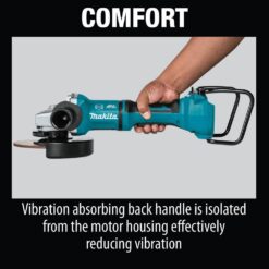 Makita, a pioneer in brushless motor technology and battery innovation, combines both in the 18V X2 LXT (36V) Lithium-Ion Brushless 7″ Paddle Switch/Angle Grinder with Electric Brake. It’s powered by two 18V Lithium-Ion batteries (batteries and charger sold separately) for 36V power and performance, and has an electronically-controlled BL Brushless motor that matches torque and RPM to the application. Makita 18V X2 means freedom from the cord, even for demanding applications like grinding and cut-off applications that often call for a corded grinder. Best of all, users can remain in one battery platform, using the same fast-charging 18V batteries on the XAG12Z1 as they use across the Makita 18V LXT cordless tool system. The XAG12Z1 is equipped with efficiency features for maximum performance. The electric brake stops the grinding or cut-off wheel in 4.5 second or less for maximum productivity, and the Electronic Torque Control turns the motor off if rotation speed suddenly slows or the wheel is forced to a stop. For consistent performance, Automatic Speed Change technology adjust speed and torque during operation. It’s part of Makita’s expanding 18V Lithium-Ion system, the world’s largest cordless tool system powered by 18V Lithium-Ion slide-style batteries. Makita 18V Lithium-Ion batteries have the fastest charge times in their categories, so they spend more time working and less time sitting on the charger.