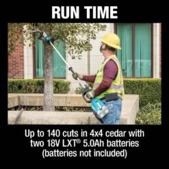 The 36-Volt (18-Volt X2) LXT Brushless 10 in. Pole Saw (XAU01ZB) is a welcome solution for a range of trimming and cutting applications. With zero emissions, lower noise and maximum versatility, the pole saw delivers maximum performance and run time without the hassles of gas and without leaving the 18V LXT battery platform. The pole saw’s shaft is 8 ft. L for efficient pruning of branches. The brushless motor delivers power of a 30cc gas pole saw to handle commercial-duty applications. The XAU01ZB also offers a 20% faster cutting speed than a 31.4cc gas engine pole saw. Torque boost mode helps power through thick or hard branches. The pole saw can make up to 140 cuts in 4×4 cedar with two 18V LXT 5.0Ah Batteries. Other features include a branch hook, translucent bar oil tank with large opening, and Extreme Protection Technology (XPT). XPT is a protective seal inside the tool, engineered for improved operation in harsh conditions by channeling water and dust from key internal components.