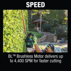 The Makita 18-Volt LXT Brushless Cordless 24 in. Hedge Trimmer (model XHU07Z, tool only) is part of Makita’s wide range of cordless outdoor power equipment. The XHU07Z Hedge Trimmer has a 24 in. blade for increased cutting capacity and a 5-position rotating handle for increased comfort when trimming vertically or at an angle. A Makita-built brushless motor delivers 4,400 SPM for faster cutting speed when set on the high speed option. The cordless XHU07Z has zero emissions and reduced maintenance: there’s no engine oil to change, no spark plug to replace, and no air filter or muffler to clean. And there’s no need to drain the fuel for storage. Simply pickup your XHU07Z, load an 18-Volt LXT Lithium-Ion battery (sold separately), and the trimmer is ready to use. The XHU07Z part of Makita’s expanding 18-Volt Lithium-Ion system, the worlds largest cordless tool line-up powered by an 18-Volt Lithium-Ion slide-style battery. Makita 18-Volt Lithium-Ion batteries have the fastest charge times in their categories, so they spend more time working and less time sitting on the charger.