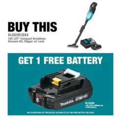 The Makita 18V LXT Brushless Cordless Vacuum Kit (XLC03R1BX4) is a compact and powerful cordless vacuum with strong suction for fast and efficient cleaning. The vacuum can be used with trigger mode or slide switch mode for ease and convenience. Compact and ergonomic design for operator comfort and, at 2.7 lbs., is lightweight for reduced operator fatigue. A bagless cloth filtration system allows for easier cleaning and quicker debris disposal. The vacuum and included nozzle and attachment feature the distinctive teal and black trade dress. The XLC03R1BX4 is a kit and includes one fast-charging 18V LXT 2.0 Ah lithium-ion battery and efficient Rapid Optimum Charger. The powerful Makita-built motor delivers up to 49 CFM. Its part of Makita’s expanding 18V LXT system, the worlds largest cordless tool system powered by 18V lithium-ion batteries. Makita 18V Lithium-Ion Batteries have the fastest charge times in their categories, so they spend more time working and less time sitting on the charger. For improved tool performance and extended battery life, Makita created Star Protection Computer Controls. Star Protection is communication technology that allows the Star Protection-equipped tool and battery to exchange data in real time and monitor conditions during use to protect against overloading, over-discharging and overheating.